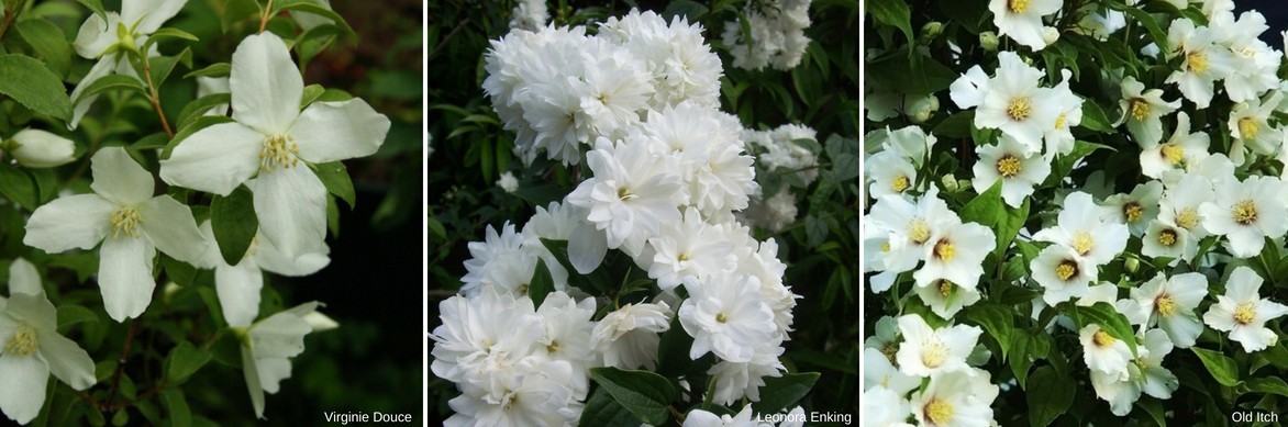 Fleurs de seringats : Philadelphus coronarius, Philadelphus ‘Frosty Morn’ et Philadelphus ‘Belle étoile’.