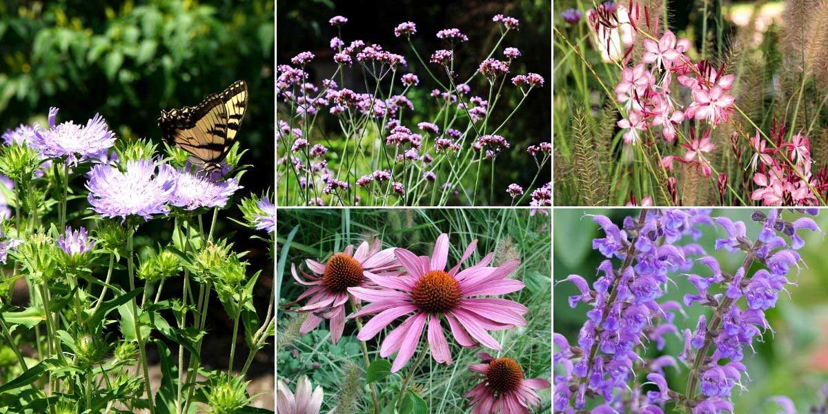 Le Stokesia est idéal dans un jardin naturaliste, avec d’autres floraisons au port libre et aéré. Stokesia laevis (photo John Winder), Verbena bonariensis (photo Karelj), Gaura lindheimeri ‘Rosy Jane’ et Pennisetum, Echinacea purpurea ‘Prairie Splendor’ et Salvia pratensis ‘Rhapsody in Blue’