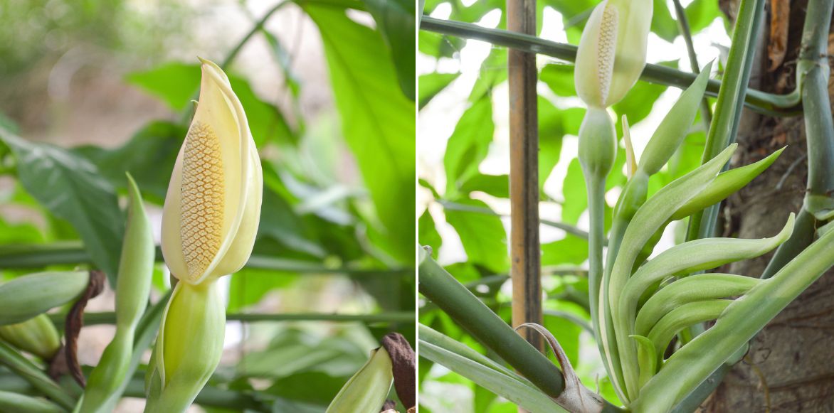 La floraison, bien que possible en culture, reste peu fréquente en intérieur. Elle prend la forme classique des Araceae, avec une spathe discrète entourant un spadice, généralement crème ou verdâtre. Ce type d’inflorescence, peu ornemental, ne se forme que lorsque la plante est suffisamment mature et dans des conditions proches de son habitat tropical. La fructification, encore plus rare en culture domestique, donne naissance à de petites baies groupées, non comestibles, contenant des graines sphériques.