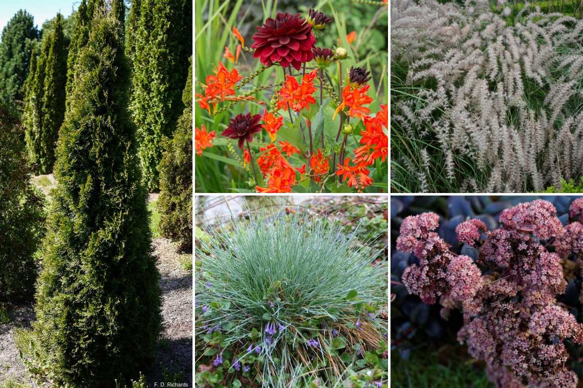 Une idée d’association pour un massif : 3 à 5 Thuya occidentalis ‘Smaragd’ entourés de Crocosmia ‘Lucifer’, de Dahlia ‘Karma Choc’, de quelques touffes de Pennisetum orientale, de Sedum ‘Purple Emperor’ et de Festuca glauca en avant-plan. N’hésitez pas à ajouter des cornouillers à bois coloré en arrière-plan pour égayer les hivers !