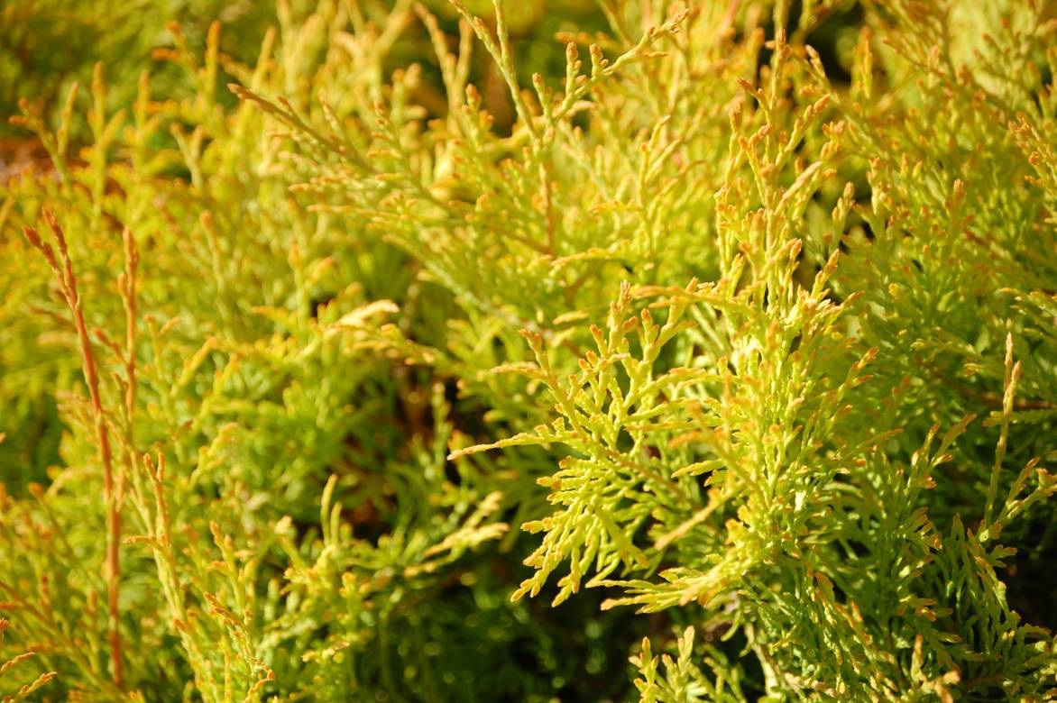 Certains Thuyas possèdent un feuillage particulièrement lumineux comme T. occidentalis ‘Rheingold’, ‘Golden Tuffet’, ‘Golden Globe’, etc