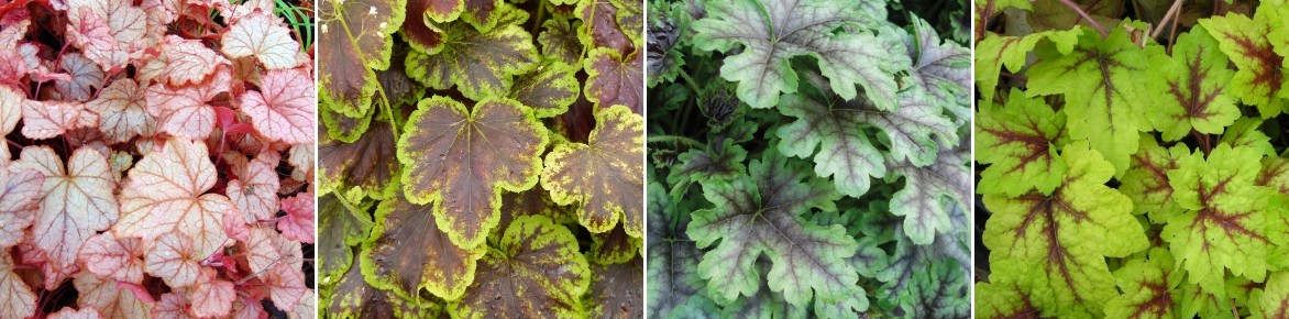 Les nouveaux hybrides offrent des coloris remarquables allant du vert chartreuse, au doré ou à l’argenté, en passant par l’orange abricoté, le rouge cuivré, rose veiné de pourpre ou le pourpre noir glacé. Elles évoluent vers des teintes cannelle, orange cuivré, rose poudré ou rubis à l’arrivée de l’été. Un veinage souvent très marqué accentue joliment le dessin des feuilles.