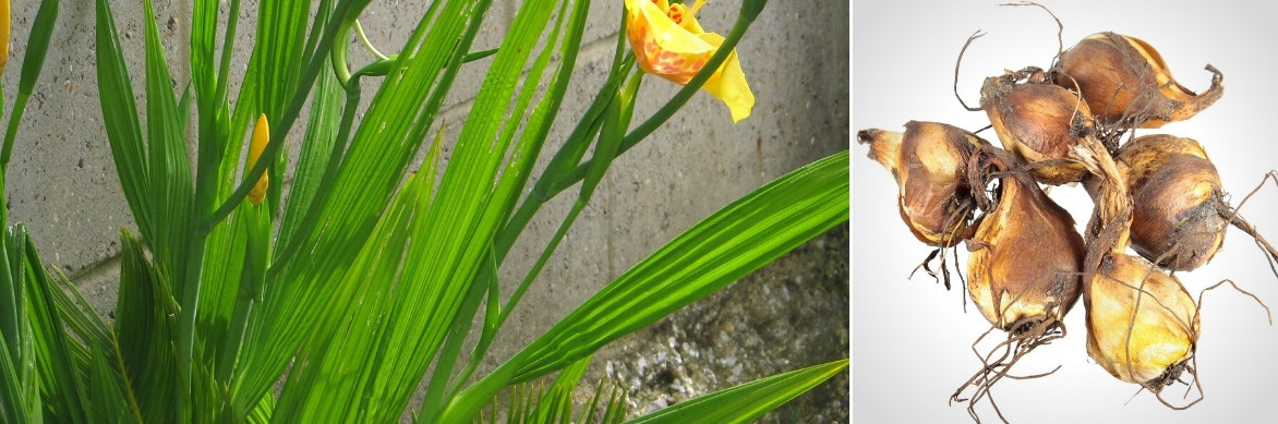 Le Tigridia se développe à partir d’un corme : il s’agit d’un organe de réserve souterrain très proche des véritables bulbes, mais constitué d’une tige souterraine renflée entourée de quelques feuilles séchées formant une enveloppe protectrice (alors que les vrais bulbes sont constitués d’écailles renflées, qui sont des feuilles modifiées). Ils permettent à la plante de stocker des éléments minéraux et de passer la mauvaise saison dans le sol à l’abri du froid, en entrant en dormance. Comme le Tigridia, plusieurs autres plantes de la famille des Iridacées produisent des cormes : crocosmias, glaïeuls, crocus, freesias…