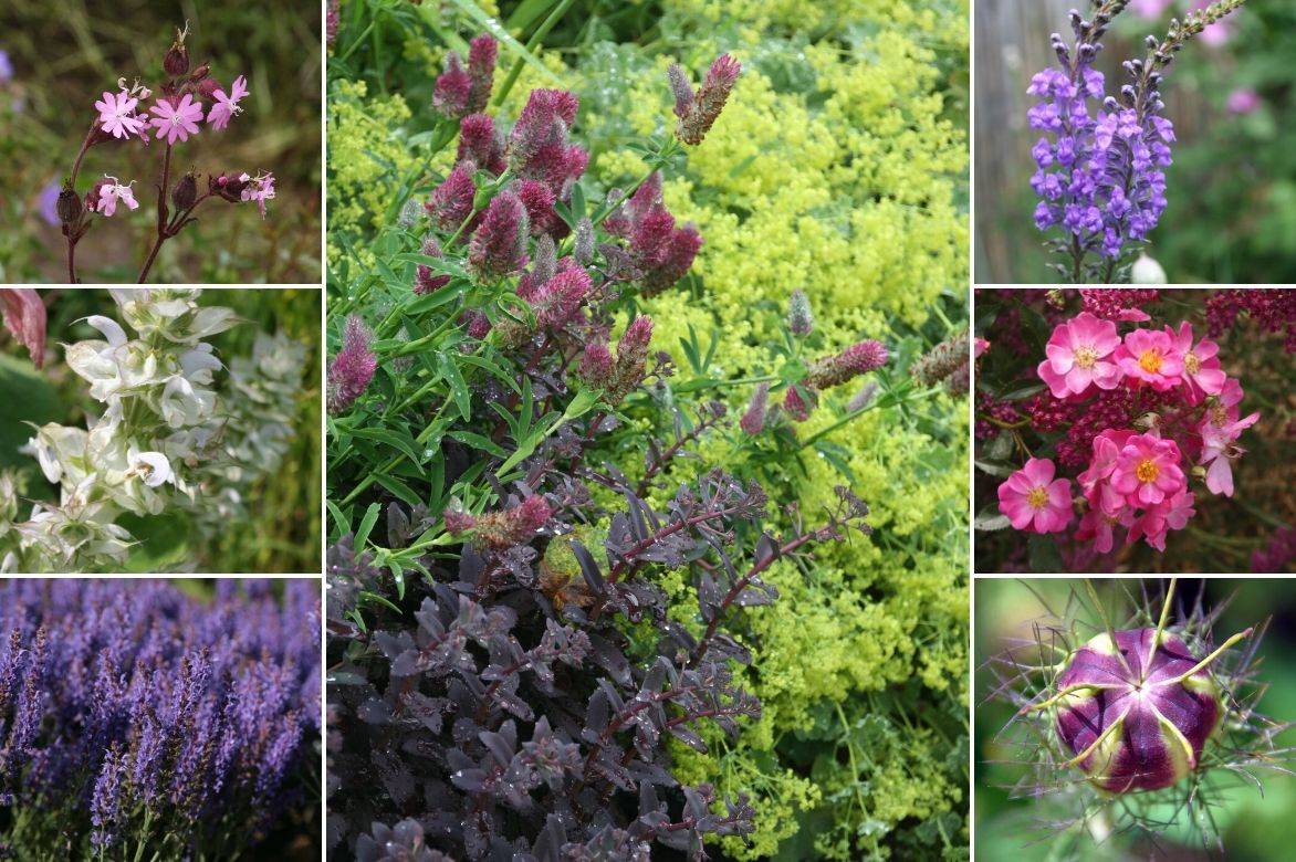 Un exemple d’association champêtre : Trifolium rubens, Alchemilla mollis et Sedum pourpre (‘Chocolate Cherry’, ‘Jose Aubergine’, ‘Purple Emperor’), Salvia sclarea ‘Vatican White’, Salvia nemorosa ‘Blauhügel’, Linaria purpurea, rosier ‘Lavender Dream’ et Achillée ‘Cerise Queen’, Silene dioica et quelques capsules de nigelles défleuries