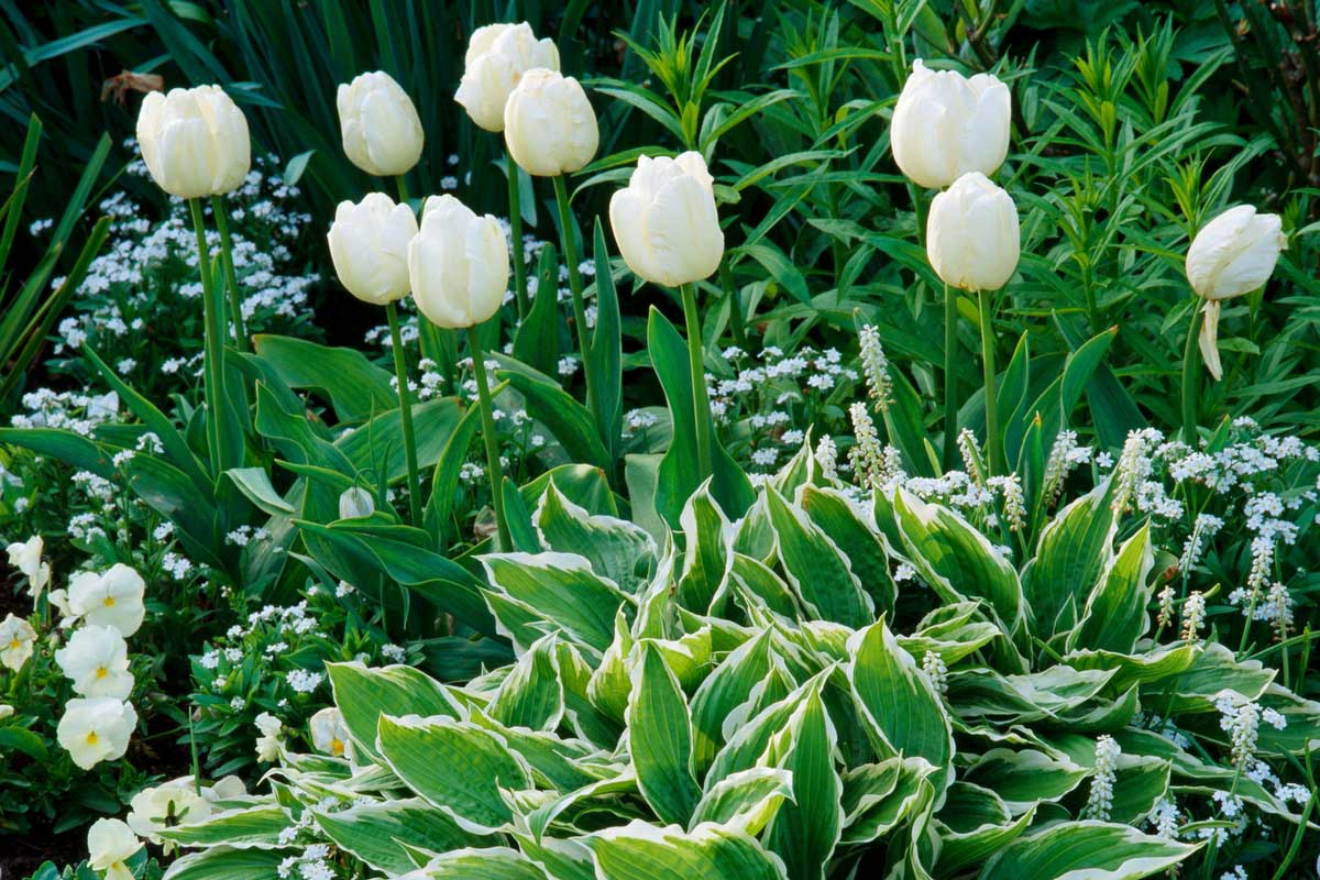 En massif, vous pouvez associer les tulipes ‘Hibernia’, aux pensées ‘Matrix White’ et hostas ‘Silver Crown’ (photo : Clive Nichols – MAP)