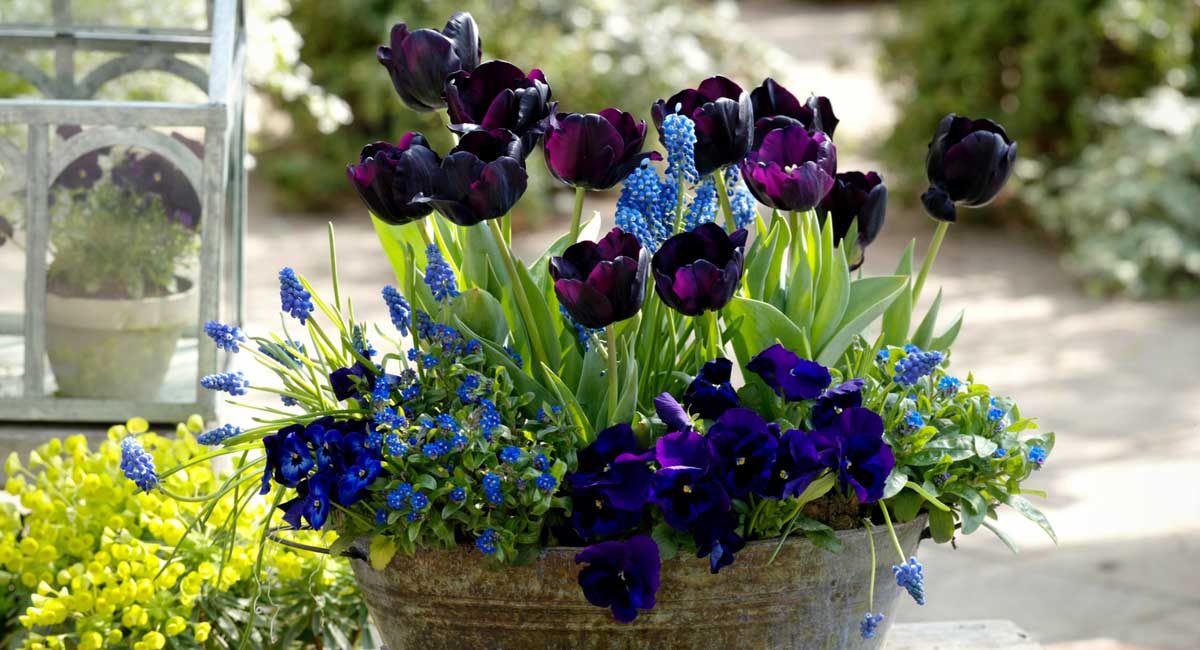 Cultivez vos tulipes en pot et réalisez une superbe composition printanière dans les tons bleu nuit, en installant par exemple la tulipe ‘Queen of Night’ avec des muscaris et pensées.