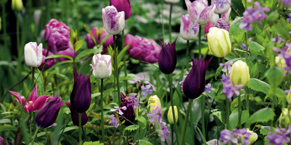 Notre collection bucolique associe les tulipes ‘Burgundy’, ‘Spring Green’, ‘Blue Diamond’ et ‘Shirley’ (photo : Pernilla Bergdahl – GAP Photos)