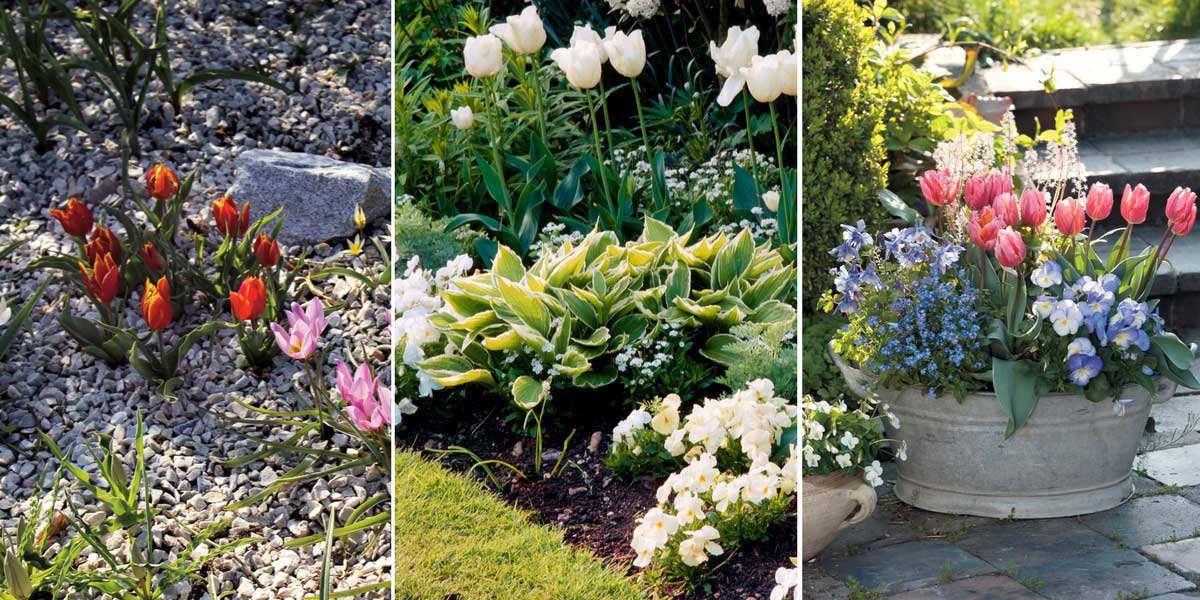 Les tulipes botaniques s’installent aisément en rocaille. / Les variétés horticoles sont parfaites pour les massifs (photo MAP – Clive Nichols) / Mais vous pouvez aussi les cultiver en pot (photo : Friedrich Strauss – Biosphoto)