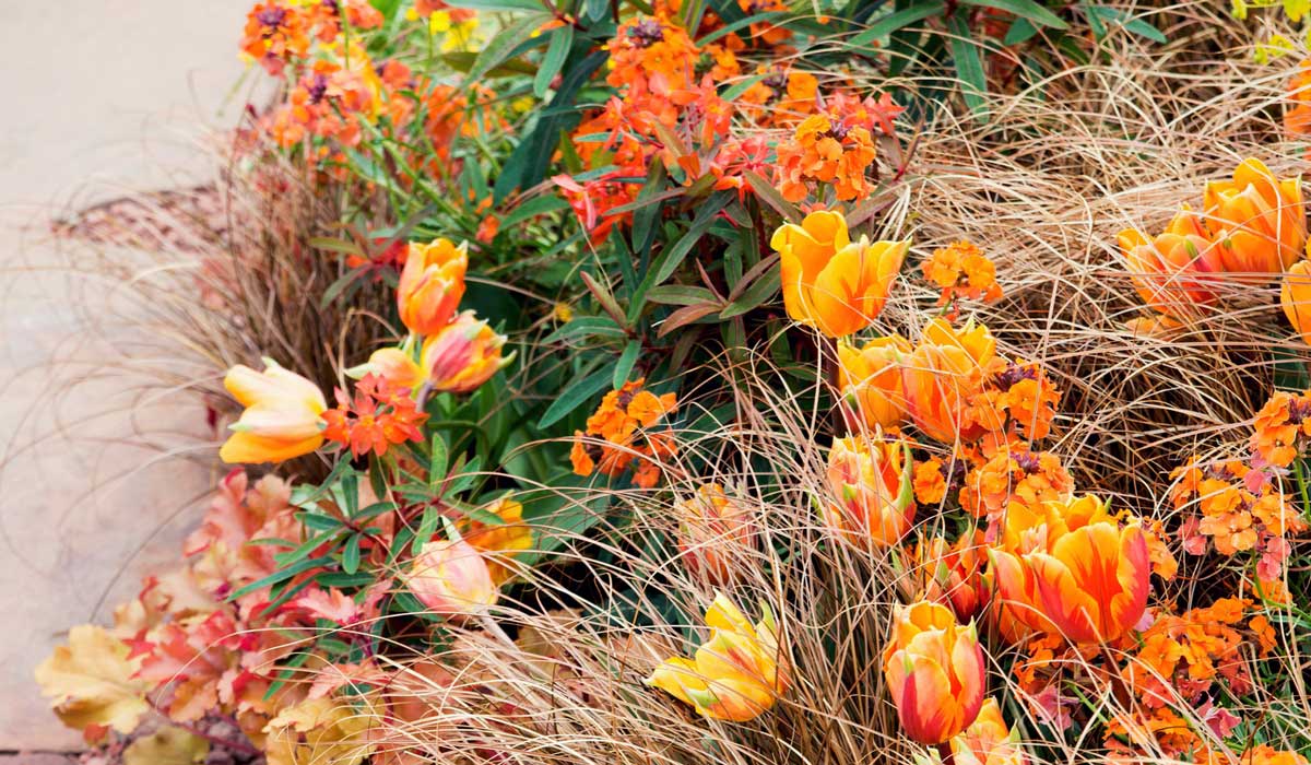 Créez une scène aux tons chauds en associant la tulipe ‘Irene’ aux Carex ‘Chocolate’, Heuchère ‘Marmelade’, Erysimum ‘Poem Mandarine’ et Euphorbia griffithii ‘Dixter’ (photo : GAP – Heather Edwards – Design Gary bristow)