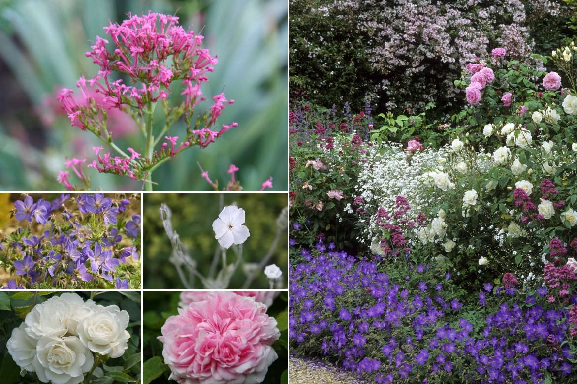Un exemple d’assocation champêtre : Centranthus ruber, Geranium vivace ‘Johnson’s Blue’, Rosier ‘Iceberg’ et un rosier rose comme ‘Jacques Cartier’, Lychnis coronaria ‘Alba’ sur un fond de Deutzia ‘Mont Rose’ (photo scène ©Andrew Lawson Flora Press – Biosphoto)