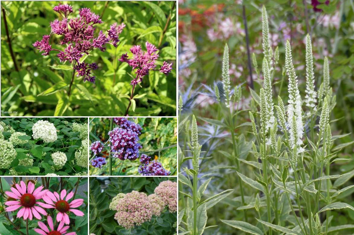 Un exemple d’association en massif : Veronica longifolia ‘Charlotte’ (ou bien ‘Schneeriesin’ si vous préférez un feuillage vert), Eupatorium maculatum ‘Atropurpureum’ en arrière-plan, Hydrangea arborescens ‘Annabelle’ ou ‘Incrediball’, Verbena bonariensis, Echinacea purpurea ‘Little Magnus’ et Sedum Autumn Joy’