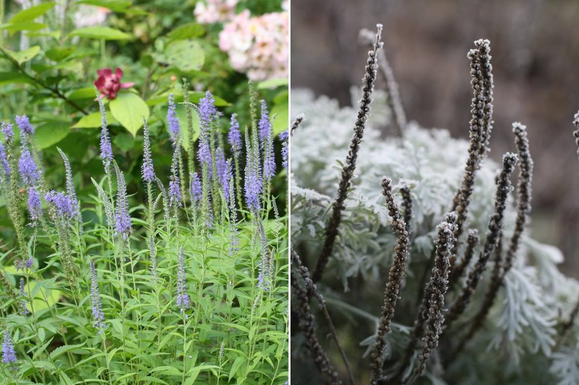 Veronica longifolia ‘Blauriesin’ en pleine floraison et Veronica spicata ‘Rotfuchs’ dont les épis fanés sont décoratifs en hiver, surtout lorsque le givre les poudre de blanc