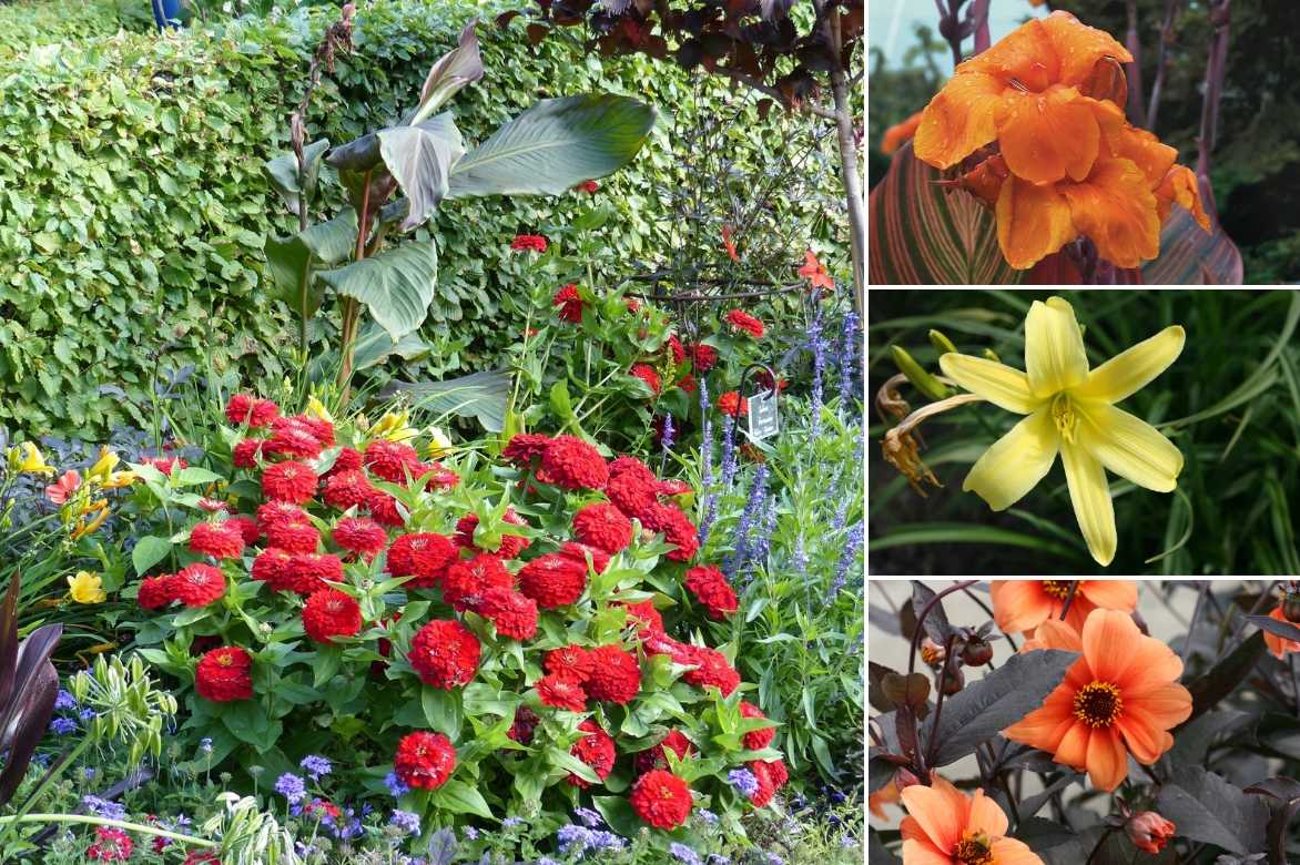 Un exemple d’association dans les tons chauds : Zinnia rouge (‘Profusion Double Hot Cherry’, ‘Profusion Double Fire’), Balisier (‘Durban’ par exemple), Hemerocallis ‘Citrina’, Dahlia paysage ‘Catherine Deneuve’ et vous pouvez compléter avec des Iberis ‘Absolutely Amethyst’, des Salvia farinacea ‘Victoria’ et des Verveines annuelles rouges