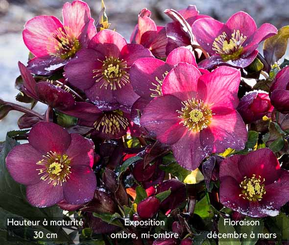 grandes fleurs de 10 cm de diamètre, intensément colorées. Né d'une hybridation puis d'une sélection rigoureuse, cet Hellébore donne une plante à la fois