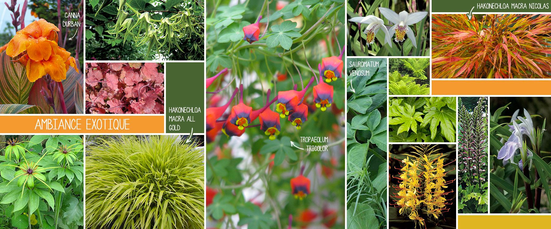 Feuillages opulents, ports architecturés et fleurs extraordinaires ; l'ambiance exotique mélange ces trois éléments. Elle combine l'abondance et la diversité des feuillages, la couleur verte est prédominante. Les bambous, palmiers, fougères arborescentes, structurent et marquent l'identité de l'ambiance. Enfin, quelques fleurs très colorées de