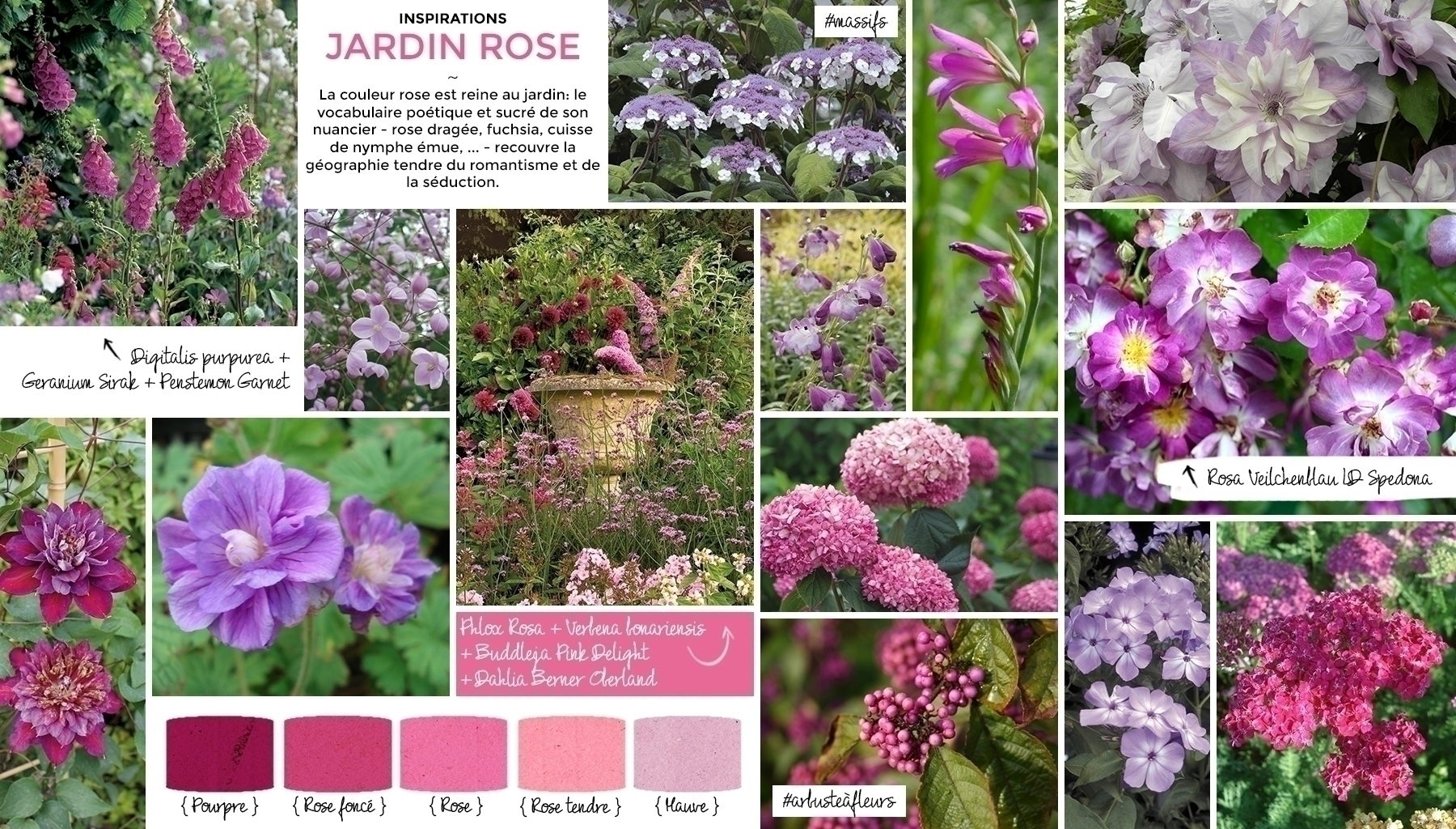 La couleur rose est reine au jardin: le vocabulaire poétique et sucré de son nuancier - rose dragée, fuchsia, cuisse de nymphe émue, ... - recouvre la géographie tendre du romantisme et de la séduction.