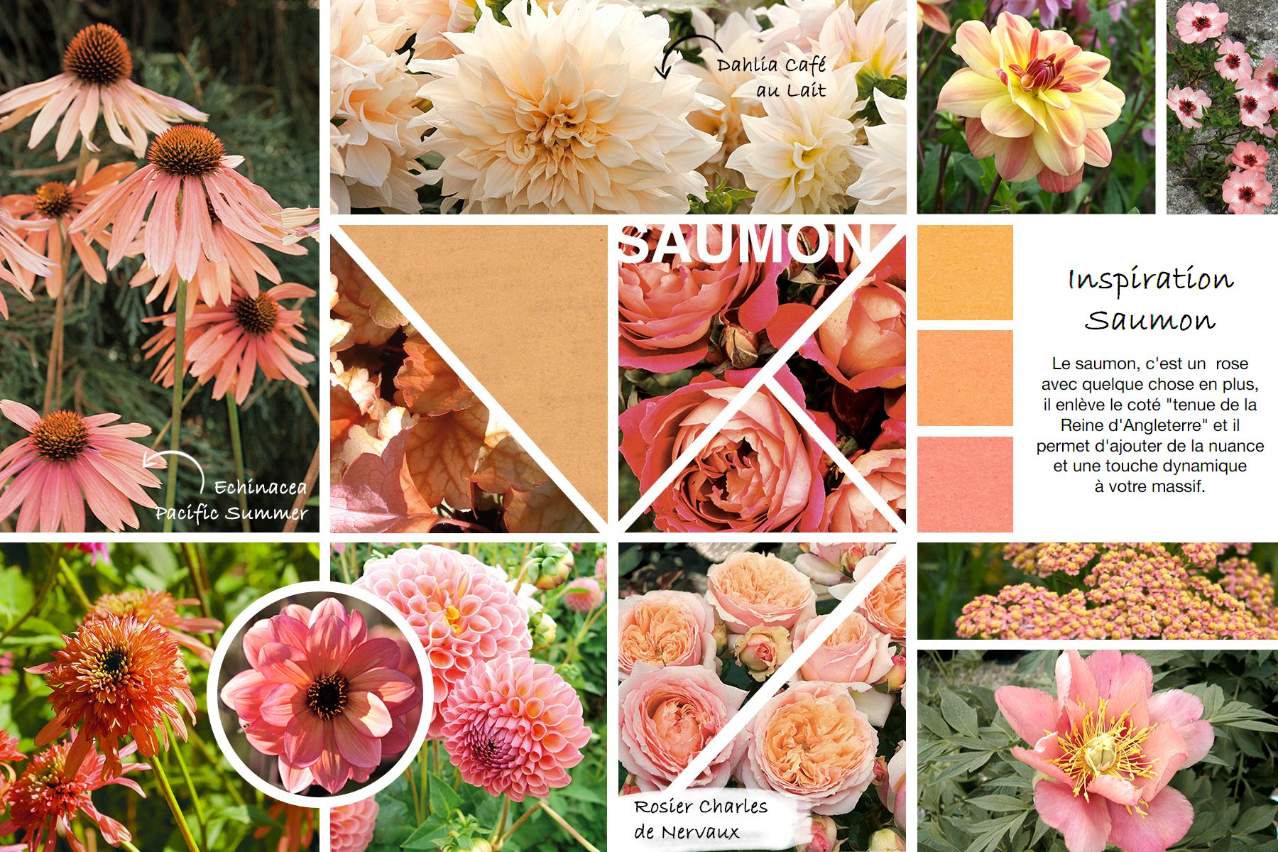 Le saumon, c'est un rose avec quelque chose en plus, il enlève le côté "tenue de la Reine d'Angleterre", il relève cette couleur un peu plate, et il permet d'ajouter de la nuance à votre massif.
