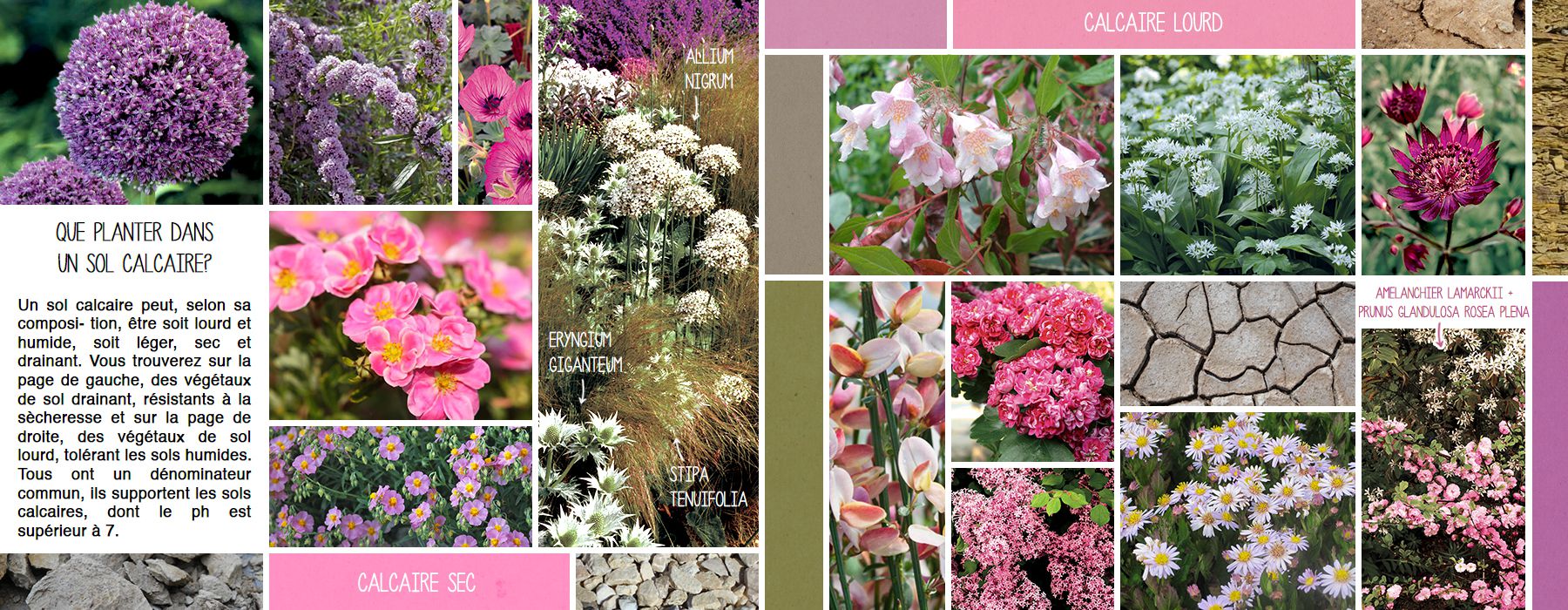 Un sol calcaire peut, selon sa composition, être soit lourd et humide, soit léger, sec et drainant. Vous trouverez sur la page de gauche, des végétaux de sol drainant, résistants à la sècheresse et sur la page de droite, des végétaux de sol lourd, tolérant les sols humides.