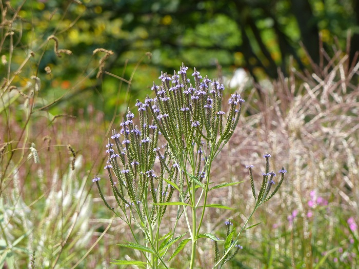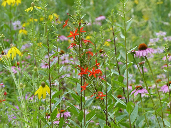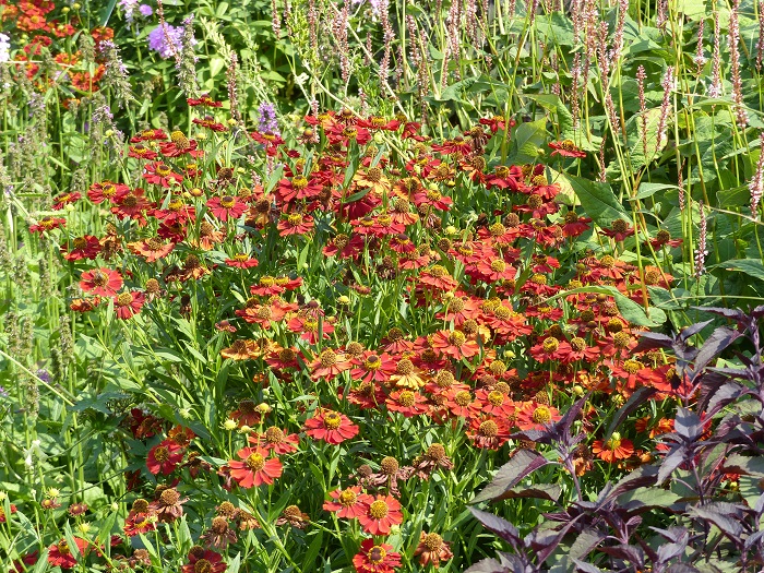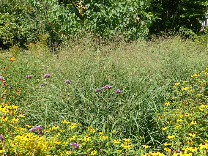 Echinacéas, liatris (les fameuses "plumes du Kansas"), monardes, solidagos, baptisias, Asclepias, asters, tradescantias... se mêlent aux très hauts hélianthus, rudbéckias, de nombreux Silphium et les impressionants Vernonia.