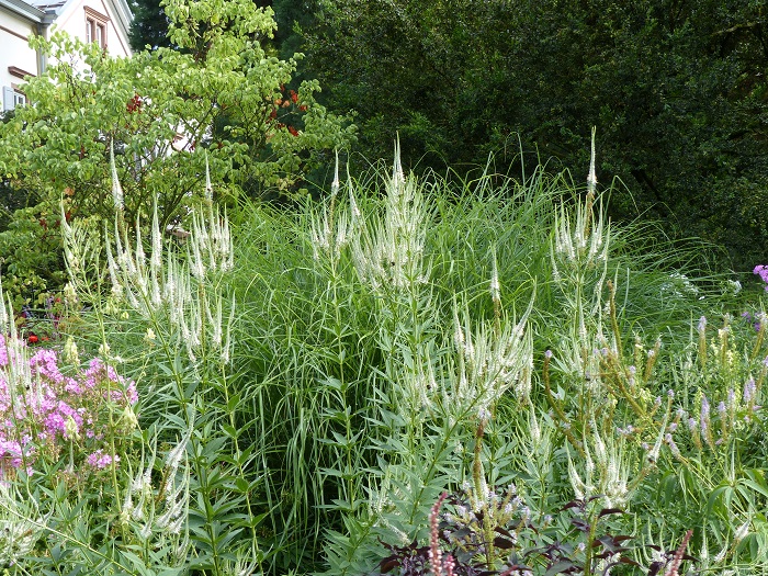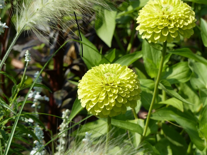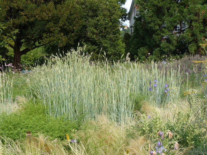 Une grande graminée annuelle ou vivace selon les régions, le Pennisetum macrourum, très utilisé chez nous dans les massifs des villes, est ici incrustée dans les plantations en masse de vivaces où elle apporte une légèreté et une luminosité incomparables. Facile et de croissance rapide, c'est vraiment une graminée qui mérite d'être encore plus connue et utilisée dans nos jardins, quitte à la replanter tous les ans si elle gèle : ses qualités graphiques justifieront amplement ce petit effort supplémentaire !
