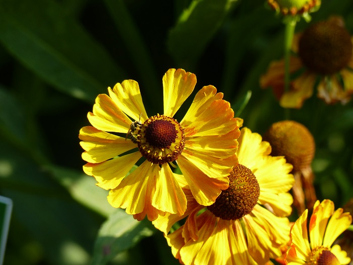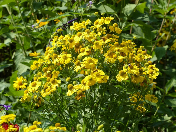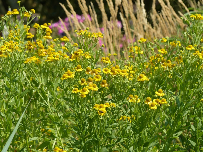 En vis-à-vis, des massifs immenses sont dédiés aux vivaces nord-américaines, qui sont en pleine floraison du cœur de l'été jusqu'à l'arrière-saison, alors que les espèces européennes ont plutôt tendance à fleurir de la fin du printemps au début de l'été. De très nombreuses espèces et variétés d'Helianthus, Rudbeckia, Solidago et une belle collection d'héléniums sont associés en une explosion de couleurs chaudes qui contraste avec le massif "Nouvelle Vague". Des touffes vaporeuses de Panicum virgatum au feuillage vert bleuté viennent néanmoins créer de grandes respirations bienvenues dans cette composition vibrante.