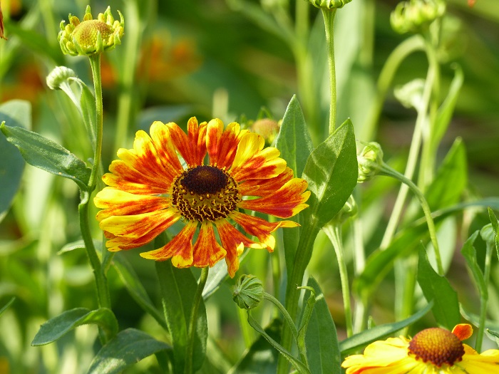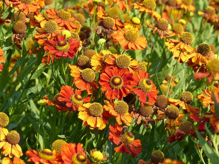 Coréopsis à grandes fleurs, Solidago rigida var. humilis, une espèce de petite taille, et Echinacea paradoxa jaunes sont associés à des Platycodon grandiflorus, la "fleur-ballon" qui n'est certes pas d'origine américaine mais pousse dans les milieux semblables que sont les steppes d'Asie du Nord-Est. Le tout est tempéré par le blond des graminées cheveux-d'ange et l'ivoire des Eryngium eburneum. Cette association très réussie est connue sous le nom de mélange "été indien" : c'est un modèle parfait à reproduire, adapté à des surfaces modestes et réclamant très peu d'entretien.