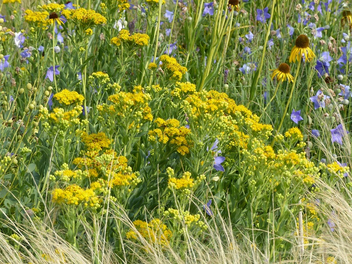 Les massifs inspirés de la prairie sèche, composés de vivaces plus basses et un peu plus précoces en floraison, sont notamment prétexte à une très belle réinterprétation naturaliste de la classique association de coloris jaune-bleu.