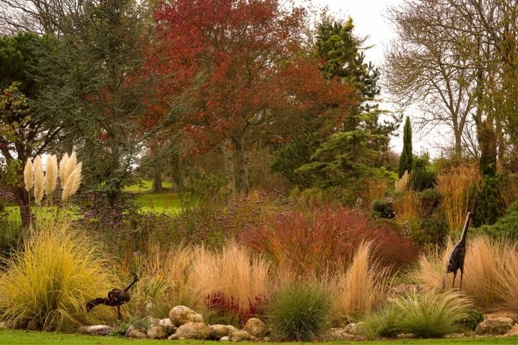 L'automne est la saison idéale pour procéder aux réflexions, changements, nouveaux aménagements ou plantations supplémentaires. D'ailleurs, en ce moment, les jardiniers sont en pleine sélection d'arbres non sophistiqués mais dotés de belles teintes automnales. Il se pourrait donc bien que d'autres Bouleaux, des Charmes et des Chênes viennent bientôt enrichir le jardin. Car si Michèle adore le graphisme et la belle présence des graminées, elle aime également jouer avec les textures, les couleurs et les contrastes. Dans tous les cas, elle n'envisage son jardin que sous un angle qui se veut respectueux de l'environnement. Ainsi, les massifs sont désherbés manuellement, l'arrosage se fait uniquement avec l'eau récupérée, et tout les « déchets » du jardin y sont directement réinvestis, comme paillage, en compost, ou même pour composer des talus. Les sujets sélectionnés sont plantés jeunes, car ils reprennent généralement beaucoup mieux que des exemplaires plus matures.