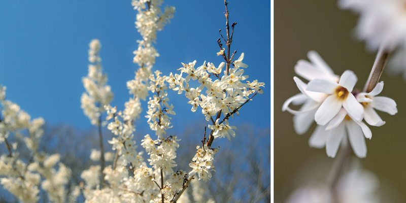 Les fleurs blanches de l'Abeliophyllum distichum sont comme des flocons de neige, on l'appelle aussi le Forsythia blanc.