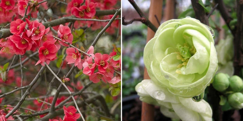 Deux superbes variétés : Chaenomeles Nicoline et le Chaenomeles speciosa Kinshiden, l'un des rares à disposer de fleurs blanc verdâtre