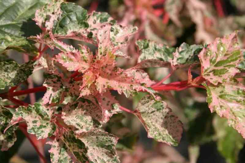 Il s'agit d'une hybridation très réussie entre l'Acer davidii (celui à la belle écorce verte) et l'Acer pensylvanicum. Son écorce rouge est striée de blanc (devenant de plus en plus blanche), et les feuilles, éclaboussées au printemps de rouge, de blanc crème et de vert, se détachent sur des pétioles rougis. Cette panachure se colore peu à peu en vert foncé, conservant un peu de crème, puis prend des teintes roses et jaunes à l'approche de l'automne. Le bout de la ramure a également cette coloration très rouge. Poussant à peine à 5 m de hauteur, ce petit érable inédit est un bijou qui plaira aux amateurs de nouveautés et de feuillages rares. Il fera sensation dans un jardin de beaux feuillages ou d'écorces.