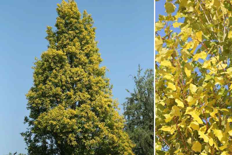 Le Peuplier noir 'Lombardy Gold', aussi rencontré sous le nom de Populus nigra 'Italica Aurea', est une très belle variété qui développe un feuillage doré ultra-lumineux sur une stature modeste pour le genre. Ce petit arbre ne mesurera en effet pas plus de 5 m de hauteur, ce qui est très réduit chez les peupliers. Ce sont ces deux critères qui en font tout l'intérêt, car on pourra même l'installer dans de petits jardins. Le port est ici particulièrement colonnaire. Caduc, 'Lombardy Gold' conserve le jaune doré de son feuillage jusqu'en automne.