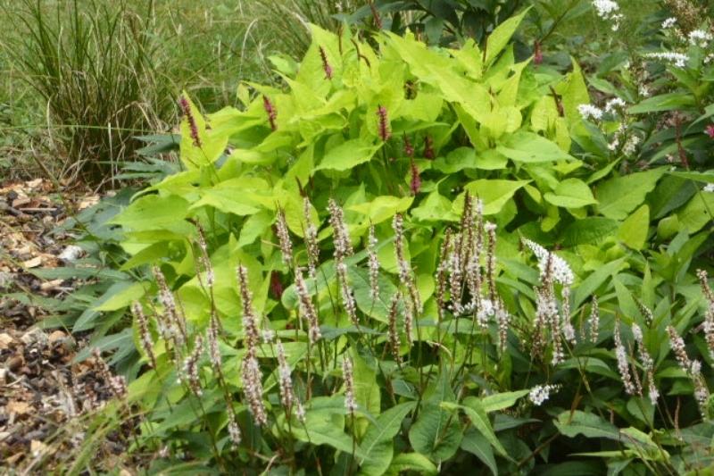 J’adore la luminosité que cette persicaire apporte au milieu de ses petites copines  'Alba' et 'Donald Lowndes', et des lysimaques cletroïdes. Elle illumine vraiment ce massif de mi-ombre, et son feuillage prend une belle couleur orangée à l'approche de l'hiver.