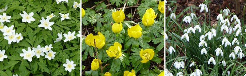 Anémone des bois (Anemone nemorosa) - Helléborine (Eranthis hyemalis) - Perce-neige (Galanthus nivalis)