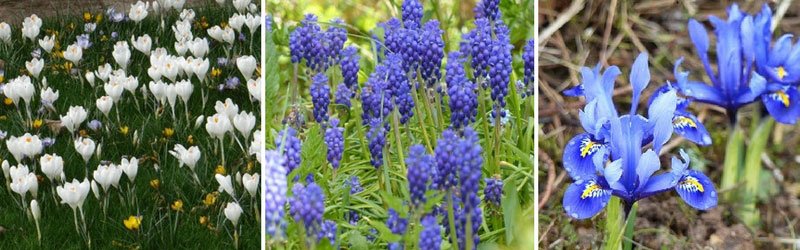 Crocus Mammouth 'Jeanne d'Arc' - Muscari armeniacum 'Blue Spike' - Iris reticulata 'Harmony'