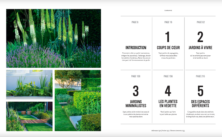 Le livre est organisé selon différentes thématiques mettant en avant des situations ou des objectifs variés : « coups de cœur » accessibles à tous les jardiniers, « jardins à vivre » pour la famille, « jardins minimalistes » avec une place faite au minéral, « plantes en vedette » avec des jardins remplis de végétaux, ainsi que des « espaces différents » illustrant des situations inhabituelles.
