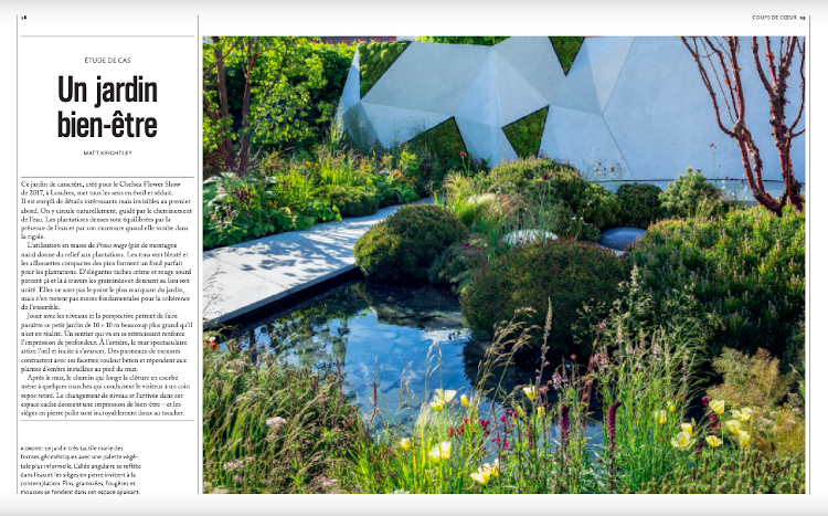 Mes jardins coups de cœur sont les réalisations de Matt Keightley pour le Chelsea Flower Show : le « Jardin bien être » et « L'espoir à l'horizon » où le design et le bien être se marient très bien avec une nature un peu foisonnante. J'ai aussi craqué pour le « Paysage méditerranéen » qui fait rêver, « Le classique revisité » qui accorde une place à tous dans la famille tout en restant très élégant et fonctionnel, ainsi que « Sérénité naturelle » très épuré mais séduisant avec son atmosphère de jardin japonais et « Une oasis cachée » avec son coin organisé autour d'un braseiro très attirant.