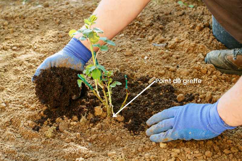 - Placement du rosier : Installez votre rosier au milieu du trou, en prenant soin de bien étaler les racines. Le point de greffe, identifiable comme un bourrelet à la base de la tige, doit être au niveau du sol ou légèrement au-dessus.