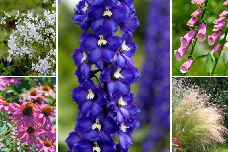 Nous l'insérons dans cet exemple aux côtés de petits Phlox blancs, de Digitales pourpre aussi élancées, d'échinacées et de Stipa tenuifolia (cheveux d'ange) choisis pour leur légèreté.