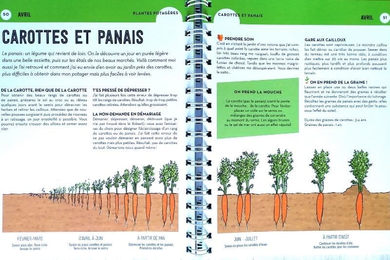 "Le potager sans se planter" est un livre, ou plutôt un guide, où l'on découvre mois par mois des fiches pratiques sur ce qu'il faut faire au potager. Il est organisé comme un journal de bord sur une année où l'on découvre les gestes essentiels, les semis et les plantations à réaliser. En début de mois, une page récapitulative nous rappel quels sont les semis et des gestes à effectuer sur la période. La lecture est simple, sans fioriture, très agréable et bourré des conseils de Régine Quéva. On y retrouve même ses astuces et quelques anecdotes, mais surtout l'essentiel : savoir quand, comment planter, semer, tailler et récolter. Chacune des fiches est illustrée et chaque légume possède sa propre frise d'évolution, allant du semis à la plante.