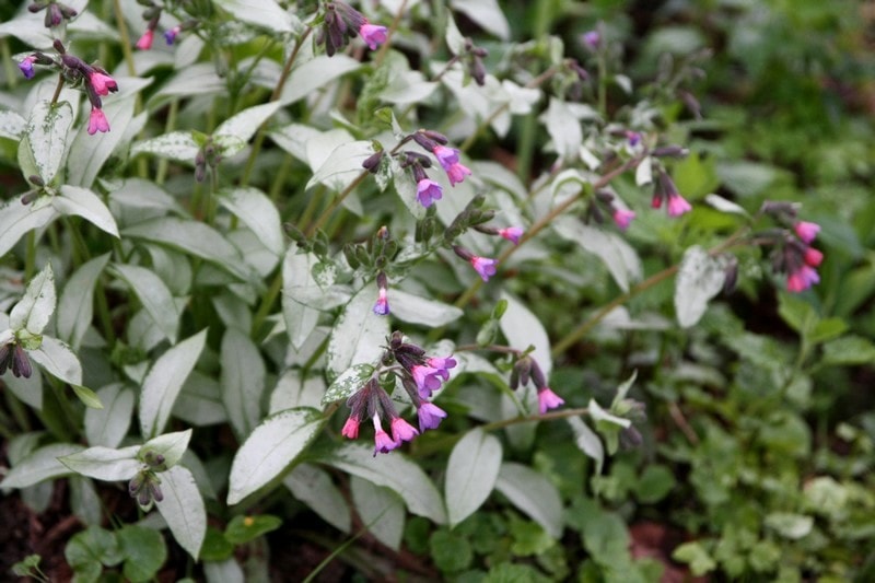 Certains cultivars présentent plusieurs nuances sur la même plante. C’est le cas de Pulmonaria saccharata ‘Mrs Moon’ dont les clochettes varient du rose au bleu pâle au gré de l’épanouissement. Le même phénomène s’observe chez la délicieuse ‘Majesté’ qui a la particularité de présenter un feuillage remarquable également. Mais si vous préférez le blanc, pas de souci, ‘Sissinghurst White’ est fait pour vous ! Ou encore ‘Opal’ d’un bleu très pâle presque blanc. A contrario, si vous voulez introduire du violet, sans aucun doute, vous vous laisserez séduire par le contraste de ‘Diana Clare’. Ou pourquoi pas le rose pourpré de ‘Leopard’ ? Il y en a pour tous les goûts !