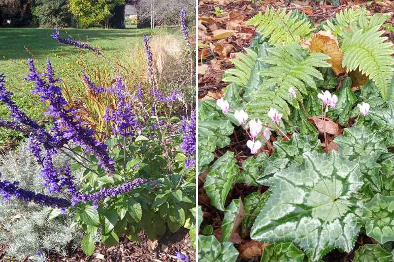 J'adore la fraicheur de leurs petites fleurs retroussées, roses et blanches, qui apparaissent dès fin août, et durent longtemps… longtemps (encore maintenant en novembre !) Le feuillage ne tarde pas à arriver, aussi séduisant que la floraison, formant un tapis vert, ciselé et marbré, vert argenté, complètement naturel dans cette zone que je traite en sous-bois. L'avantage de leur naturalisation est que l'ensemble se propage de façon très spontanée. Le feuillage disparait entièrement en été, laissant la place aux autres couvre-sol et vivaces.