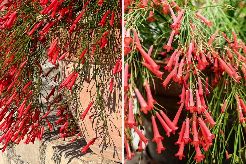 Originaire des zones tropicales d’Amérique centrale, cette plante vivace peu rustique (rusticité : -6 °C) se distingue par ses longues tiges souples et arquées, qui rappellent un peu celles des prêles. Ce feuillage fin et élégant forme un joli port retombant, parfait pour les pots, les grandes jardinières ou même les rocailles ensoleillées. Mais ce sont surtout ses fleurs qui captivent. D’un rouge vif tirant sur l'orangé, elles se présentent sous forme de petits tubes qui s’épanouissent par centaines, donnant l’impression d’une cascade de corail. La floraison, généreuse et continue, commence au printemps et se prolonge souvent jusqu’à l’automne.