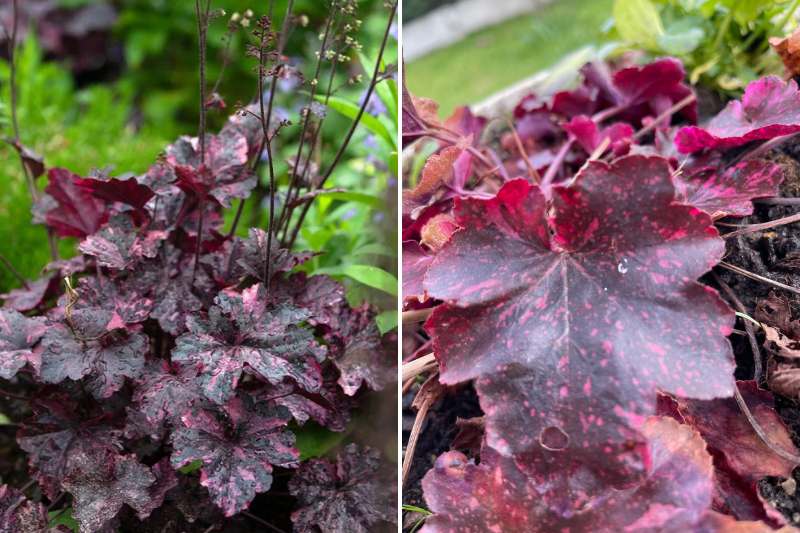 Plantée en pot rond, mon heuchère aux feuilles noires ponctuées de rose mérite tous les honneurs. C'est pourquoi, au fil des saisons, avant qu'elle ne forme une belle touffe compacte et dense, je lui associerai des annuelles en hiver (des pensées en ce moment, climat rude oblige !). Et pendant ce temps-là, les bulbes printaniers se préparent à lui faire une haie d'honneur au réveil du printemps.