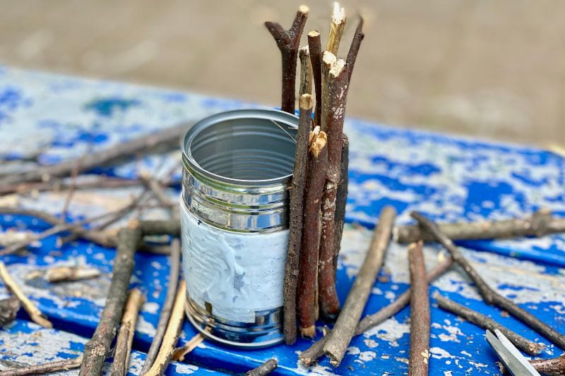 - Avec votre enfant, repérez et ramassez des bouts de bois de différentes tailles. Si les branches sont trop longues, cassez-les ou taillez-les pour qu'ils s'adaptent à la hauteur de votre boîte.