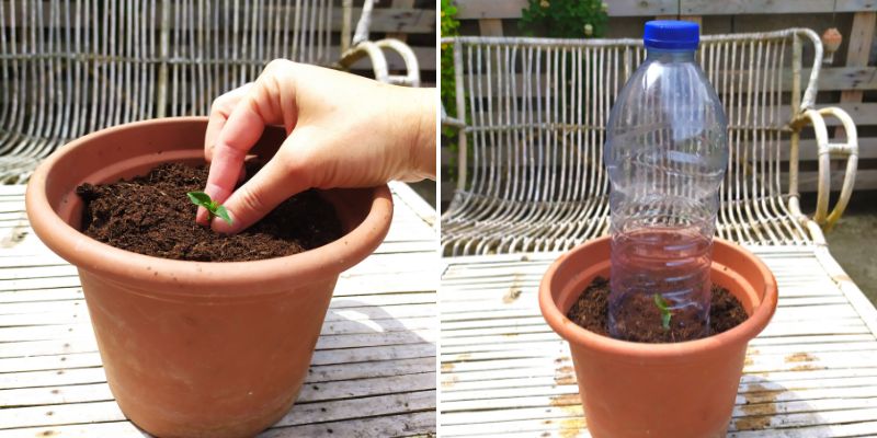 Plantez la tige et installez une cloche (ici le haut d'une bouteille en plastique) pour réaliser une bouture à l'étouffée