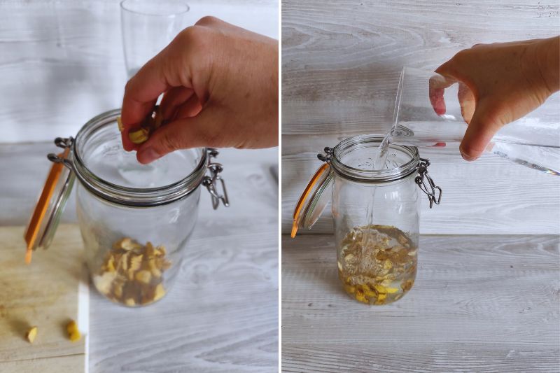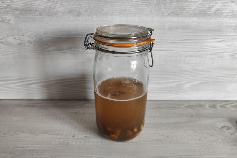 3- Fermez le couvercle du récipient et laissez macérer le mélange pendant environ 48 heures en le remuant de temps en temps pour favoriser une fermentation uniforme.