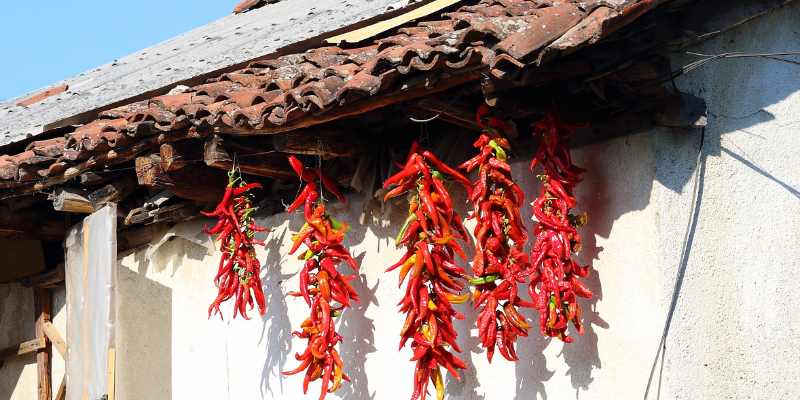 Dans nos régions les moins exposées, après la récolte des piments, suspendez-les en botte par une ficelle dans une pièce de la maison sèche, chaude (20°C minimum) et ensoleillée afin que l’humidité s’évapore. Vous pouvez faire sécher vos piments derrière une fenêtre. La pièce doit être bien ventilée. Le séchage peut prendre trois bonnes semaines pour que vos piments soient secs. Retournez les piments régulièrement.