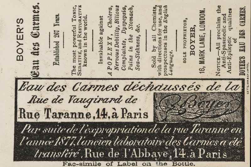 Invention de l’apothicaire Pierre Boyer en 1611, l'eau des Carmes est un mélange précis d’eau, d’alcool et de quatorze plantes aromatiques et neuf épices, présenté alors comme un élixir miracle. Vendue comme remède universel (et servant même d'eau de toilette à la cour de Louis XIV), elle devint un tel succès que Louis XIII en fit sa potion officielle, et les Carmes, malins, en tirèrent profit en la produisant dans leur couvent. Pour l'anecdote, Richelieu conservait toujours une petite fiole d’eau de mélisse pour calmer ses terribles migraines, qu’aucun médecin de l’époque ne pouvait enrayer. Cette "eau" traversa les siècles jusqu’à devenir une légende parisienne, s'exportant peu à peu dans nos pays voisins, Angleterre, Espagne, Allemagne et Italie.