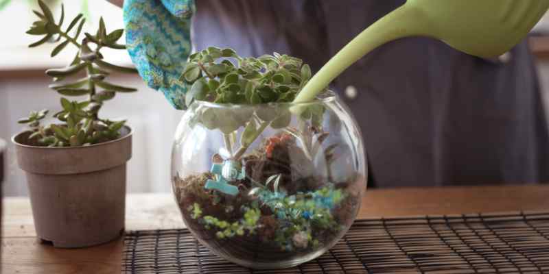 Disposez éventuellement quelques éléments décoratifs (galets, morceaux de bois, sujet, etc.) pour personnaliser votre terrarium. Puis arrosez de façon différente selon les plantes :